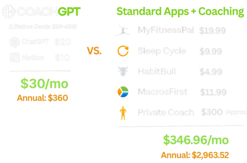 Why pay monthly for five different apps and a coach — when CoachGPT gives you the tools to build it all yourself, for a fraction of the cost?
